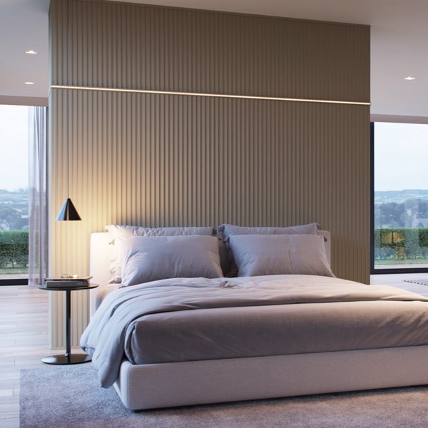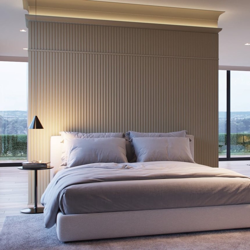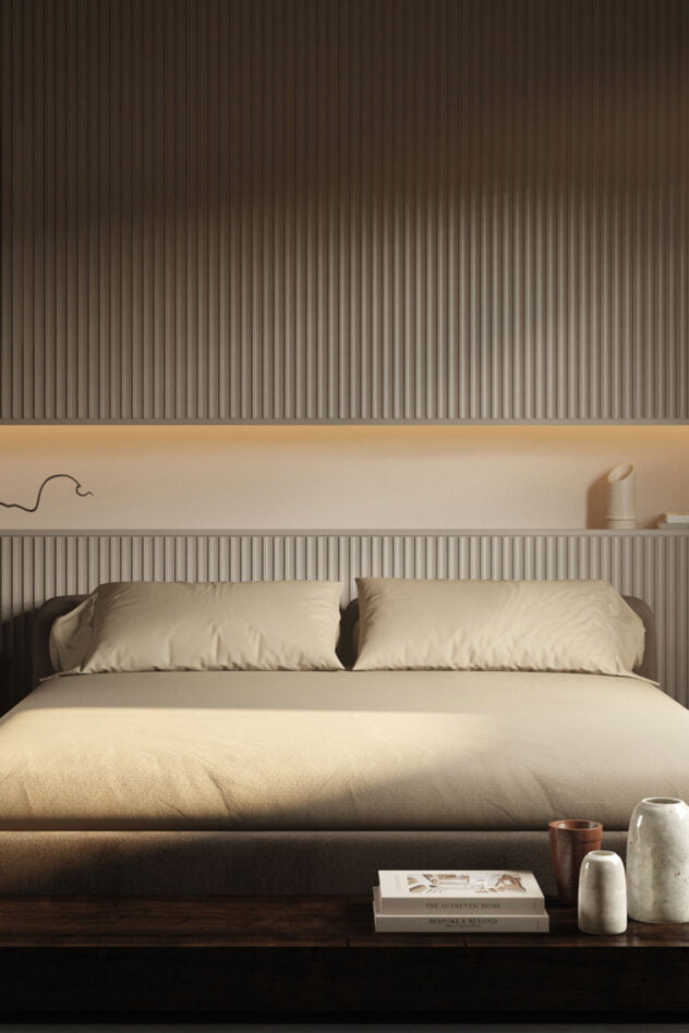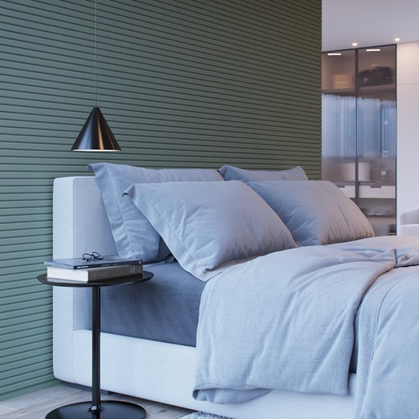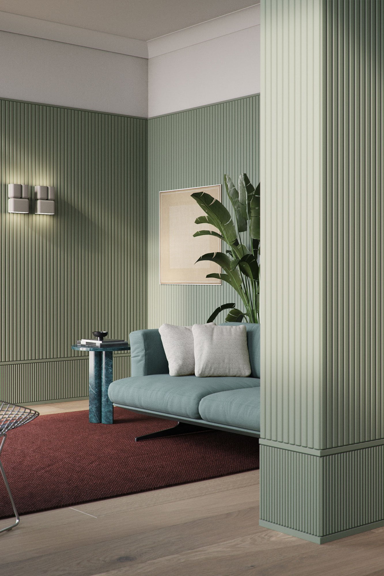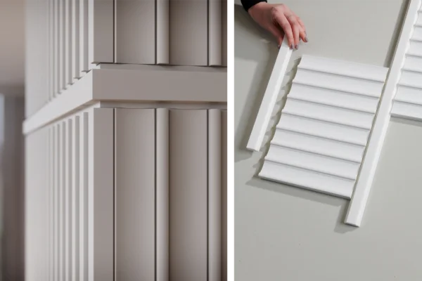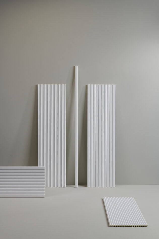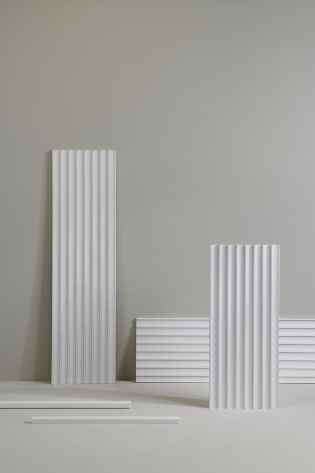 As its name suggests, the linear element Dorique refers to the surface of the columns typical of Ancient Greek architecture. Installed vertically, these panels with hollow grooves accentuate the height of a wall and make it possible to alter the perception of a space.