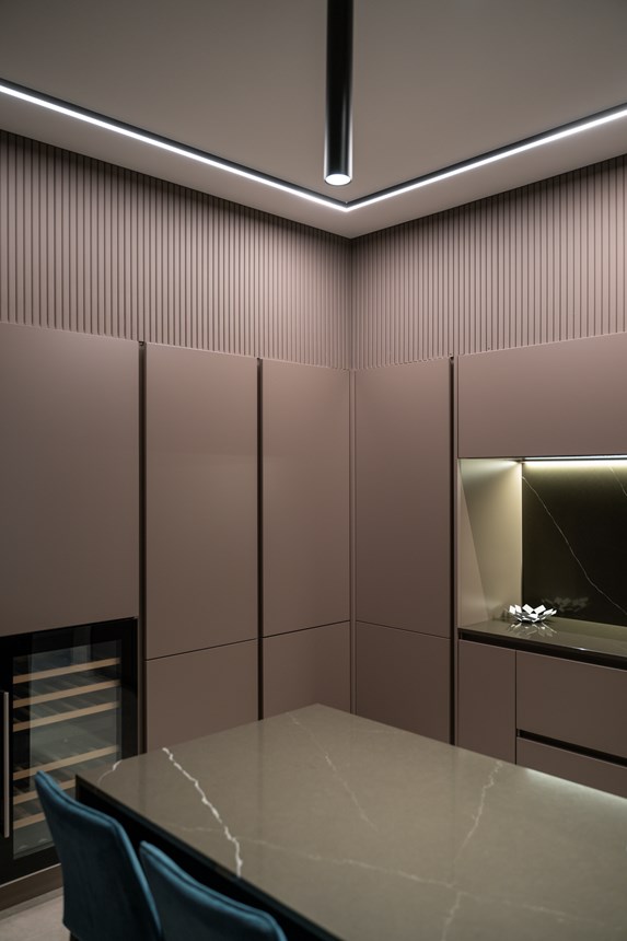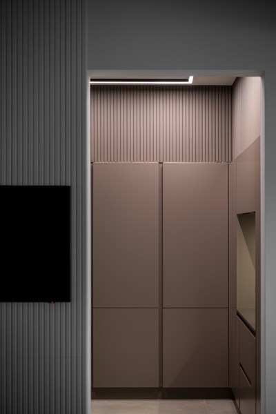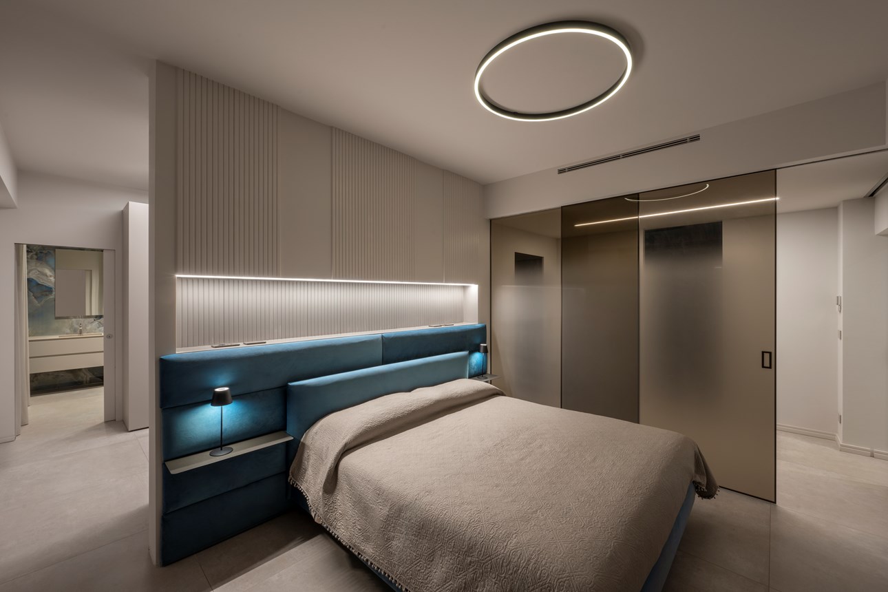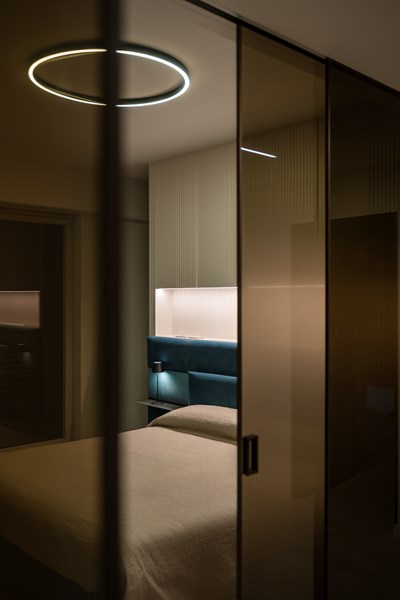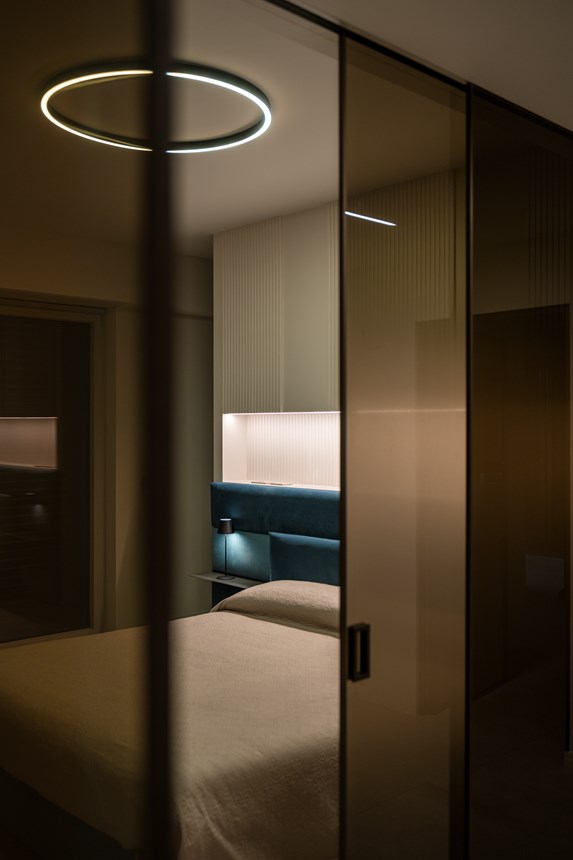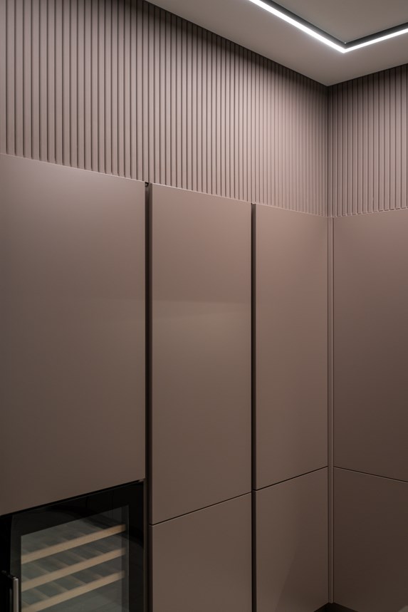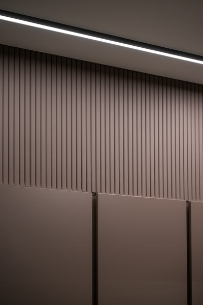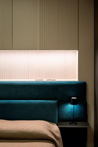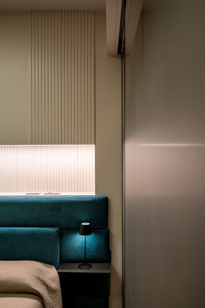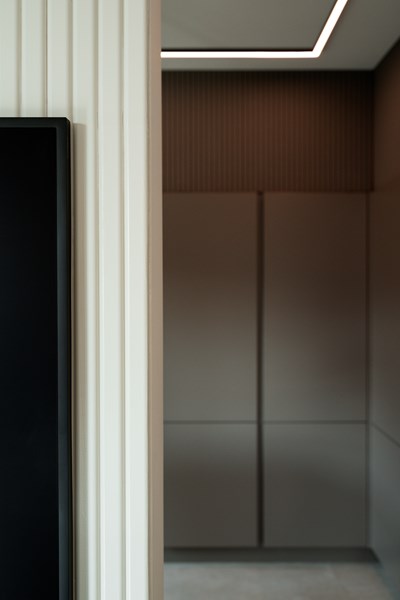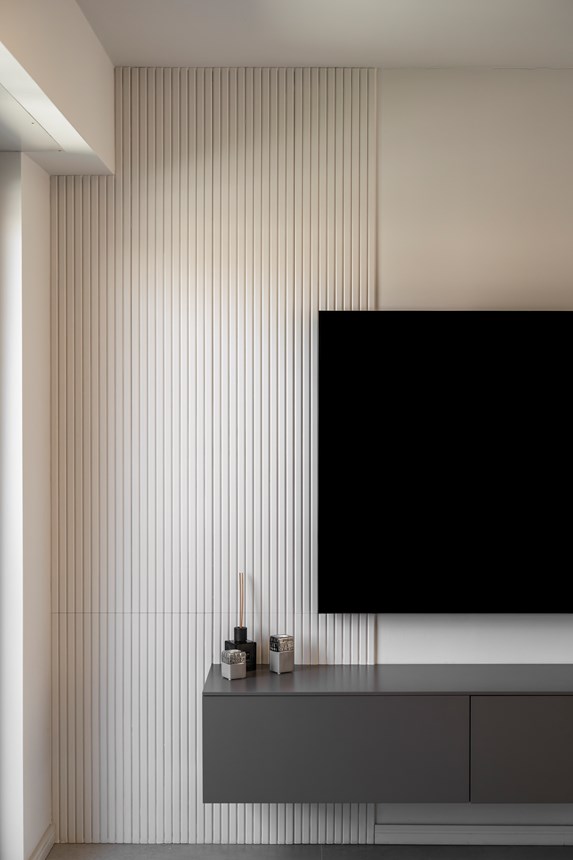 Finally, the master bedroom. The characteristic, linear theme of the CANELÉ L wall panel perseveres and defines the back wall, wrapping the space in its quiet elegance. Just like in the other rooms of the apartment, the CANELÉ was used to give character and to enhance the bedroom’s design and aesthetic appeal. Here, the panels were spaced, giving the room rhythmic, intriguing and dynamic architectural qualities.