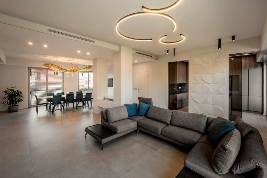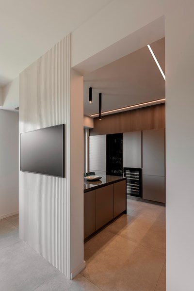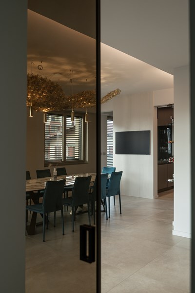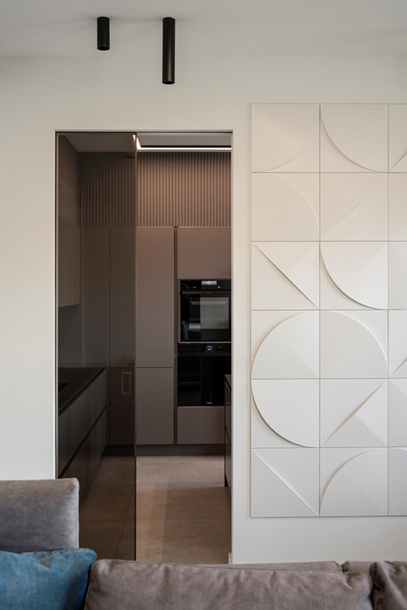Stepping into the spacious living area, one immediately notices its multifunctionality. To the left is the main dining area. A space where guests, friends and family come together and share meals in style. Working silently yet effectively in the background are the CANELÉ L wall panels. Painted in the same light colour as the rest of the room, the panels bring a modern, refined texture to the partition without cluttering the wall décor.