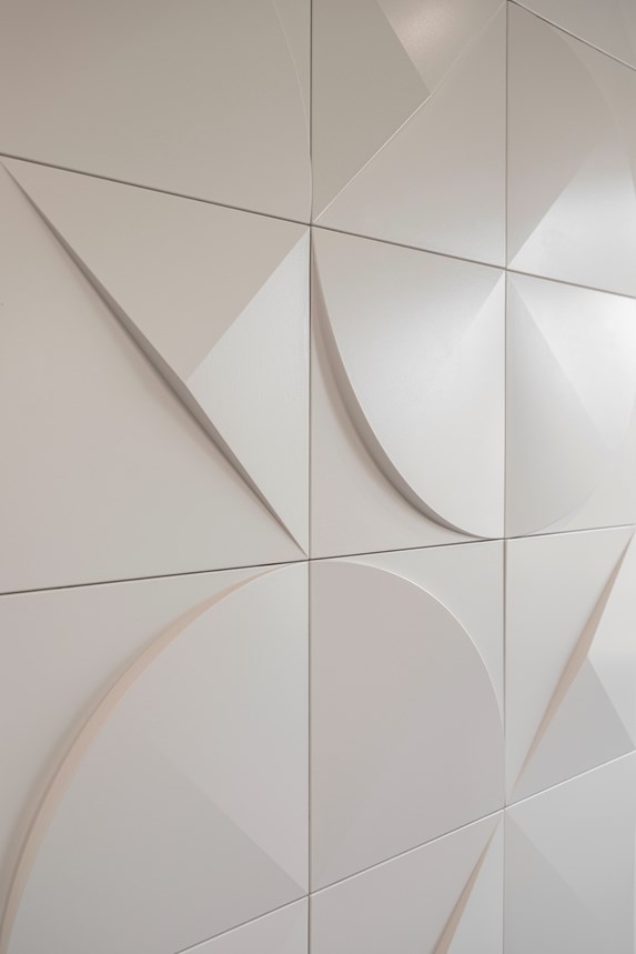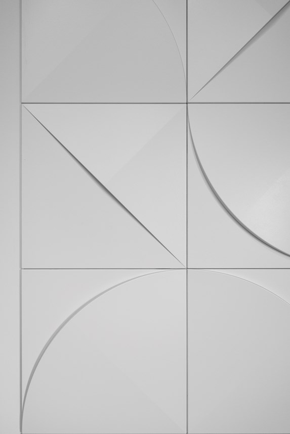 To the right, in the sitting area, the back partition wall is decorated with an almost artistic constellation of NOËL & MARQUET wall tiles. As a result, this wall becomes the room’s true statement piece and main focal point. The CURVE and PUZZLE elements work together in perfect harmony to create a strong and resolutely modern eye-catcher. On the TV wall, the CANELÉ L panel ads, again, more discrete yet precious decorative texture.