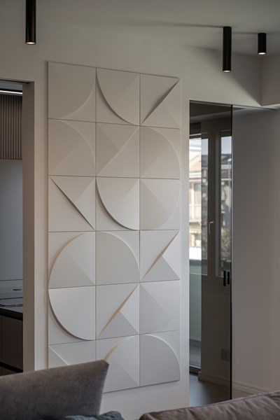 This high-end interior project takes us to the heart of the Piedmont region of northern Italy. For her “caffelatte” project, Italian interior designer and architect Carola Ribotta turned a city apartment into a luxurious, contemporary space full of intricate details and eye-catching wall designs using a carefully curated selection of NOËL & MARQUET design elements. With the contrast of light walls and warm brown accents inspiring the project’s name, discover how our wall panels and wall tiles infuse a resolutely modern touch and redefine the space’s textures and overall personality.