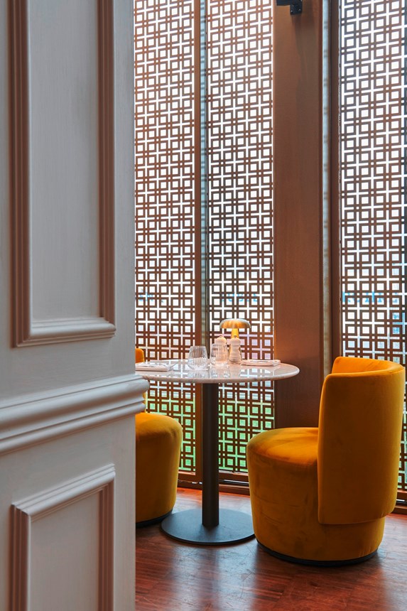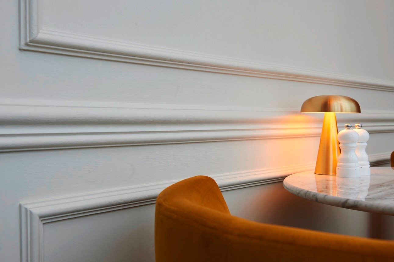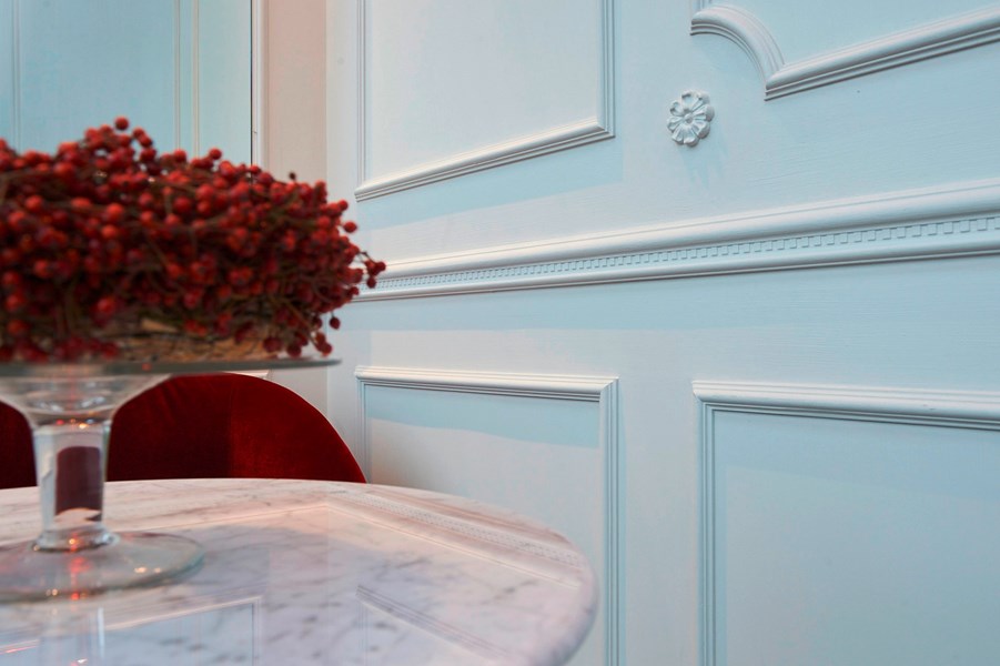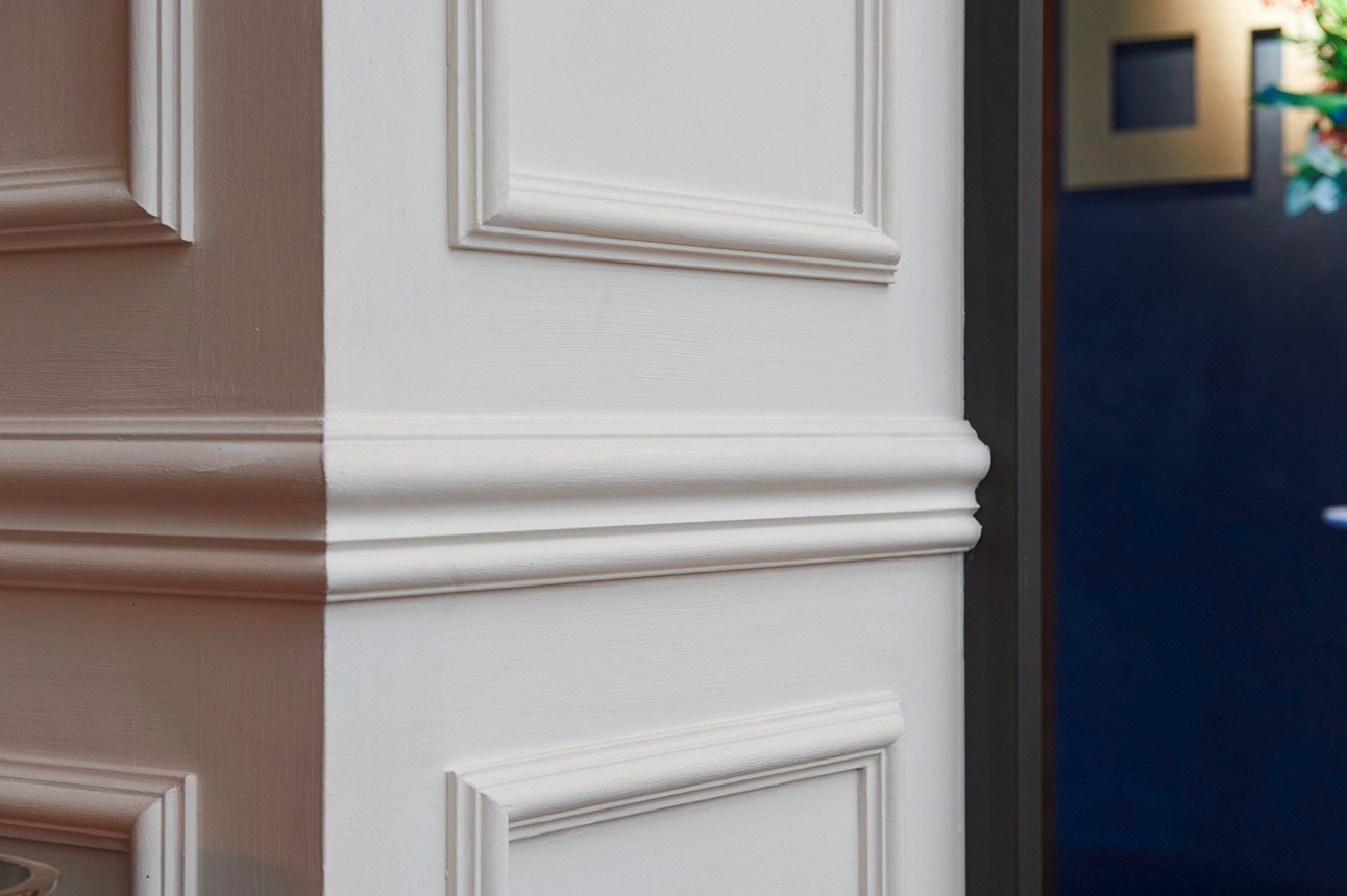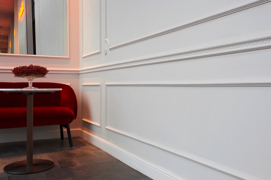 The lighter areas of the brasserie and bar play on the abundance of natural light and the spaces’ impressive height to plunge visitors in a setting characterised by its luxurious atmosphere and grandeur. Here, the French influences and Parisian-bistro inspirations emerge to give the restaurant its signature style and feel. In this sense the Z10 chair rail takes centre stage, enveloping the space in its subtle elegance. The fine and characterful moulding is mostly installed in Hausmann-style frames accentuating the walls’ dimensions and creating a stunning classic decorative effect.