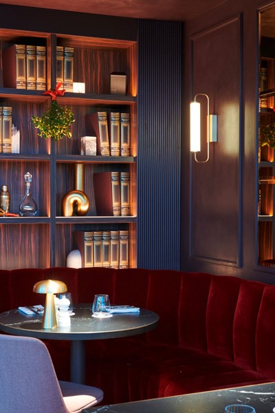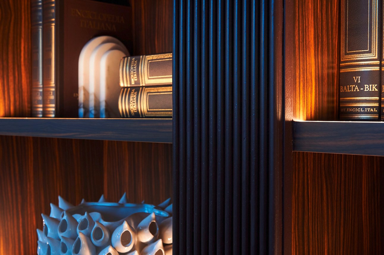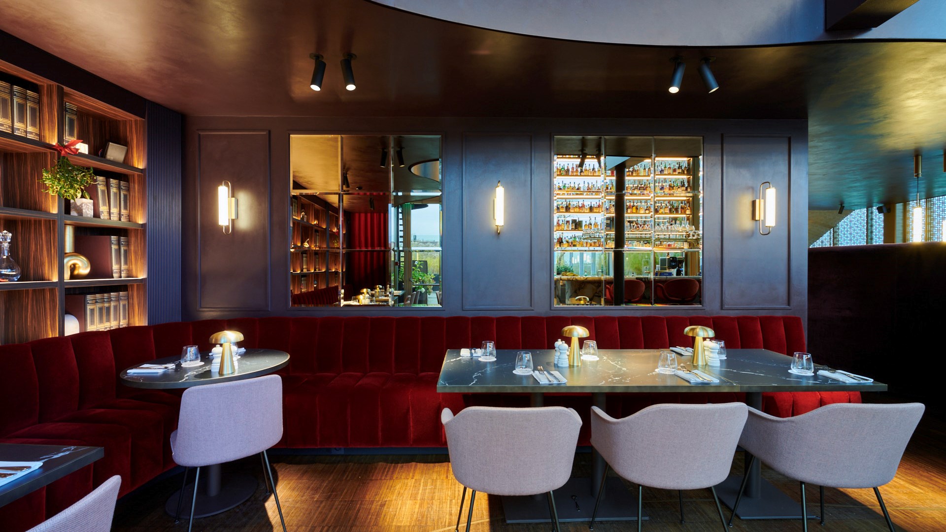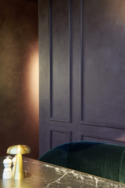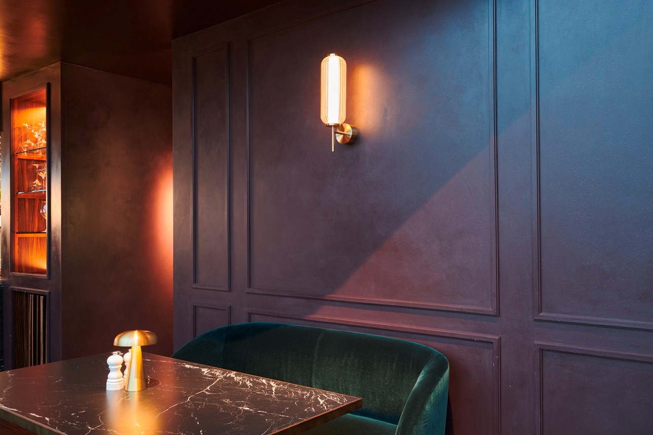 The darker areas of the brasserie were designed with conviviality and comfort in mind. By mixing warm materials, colour palettes and lighting shades, this area feels like a secluded cocoon where meals are shared in intimacy. On the walls, the modern and linear WL10 chair rails were installed in frames, giving the space a clear sense of structure. On the face of the imposing shelves, the CANELÉ S panels were painted in a dark brown colour, almost giving an illusion of hand carved mahogany details.