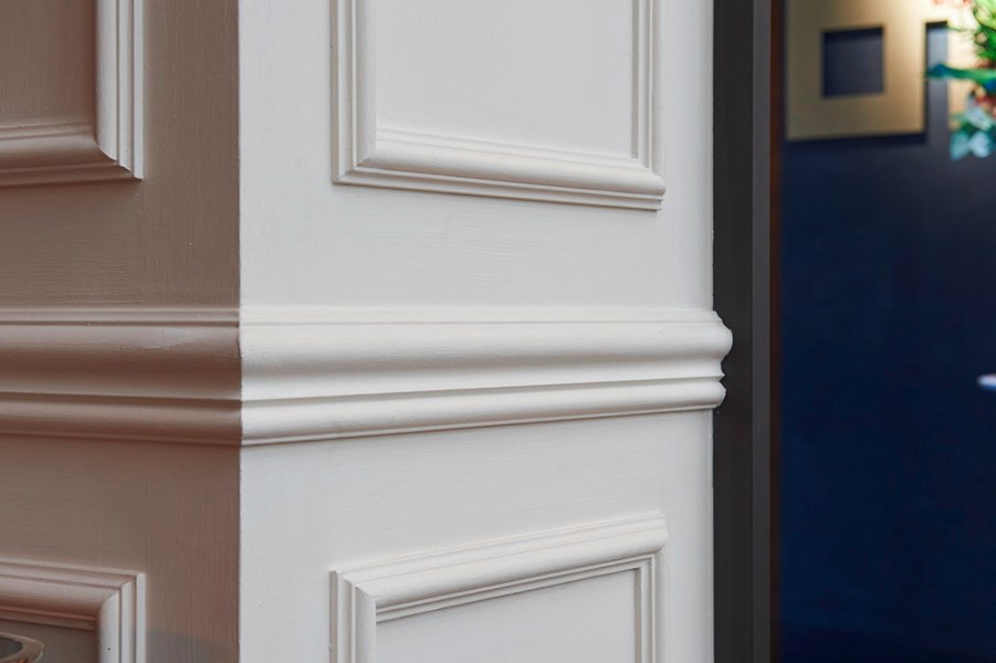 Interior architect and project designer Charlotte Wastiau recalls the original brief for this complete refurbishment project. “The client primarily aimed to create a highly international atmosphere, where it was important to combine different styles with a wide variety of elements and details to achieve an overall cozy and warm ambience”. From the beginning, this was going to be a project where the details truly mattered. In this new rendition of Link 21, architectural details and decorative accents are everywhere to be found. In the entrance for instance, the small R17 ceiling roses combine elegantly with the Z10 chair rails and Z102 corners, setting playful and sophisticated decorative accents. Architectural details even follow in the bathroom where the waterproof and shock resistant FB2 skirtings were installed. Decorative mouldings of all kinds are omnipresent, bringing a sense of decorative unity and adding the subtle yet expressive finishing touches that make the interior special.