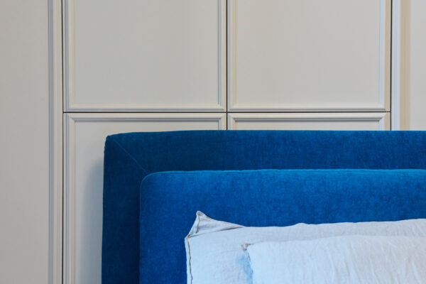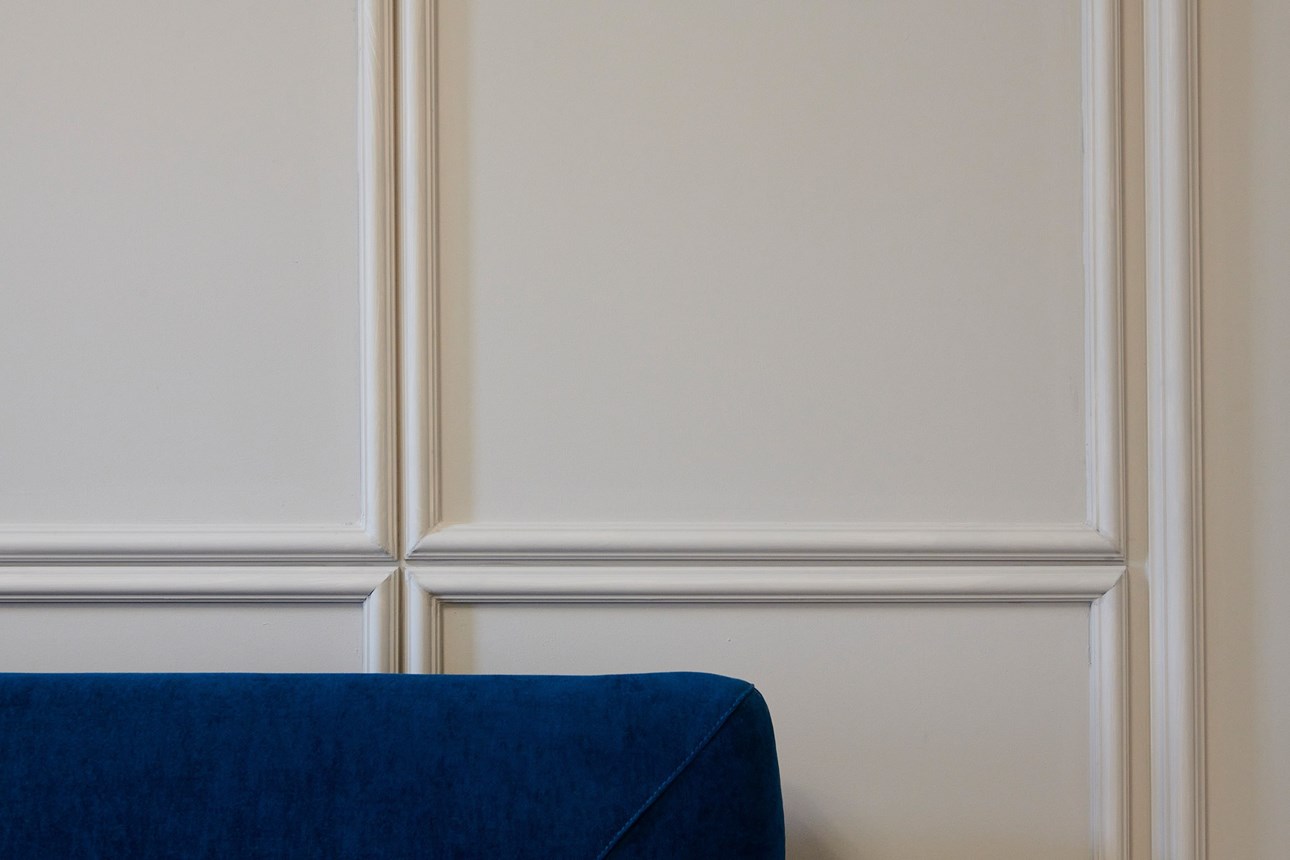 In the bedroom, the profiles add a personal touch to the space behind the bed. The chair rails were placed on a wall cupboard that had been primed and painted to match the colour of the walls. The ease and relative speed with which the chair rails can be installed means that you can decide to add profiles or make changes as you go along. This was the case for the frames in this bedroom too. At the time of the initial design, neither this profile nor this design were planned. As you can see, the ceiling and wall frames are in perfect harmony with each other, even though they date from different periods.