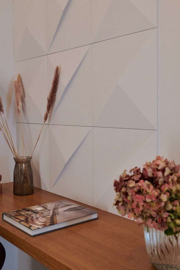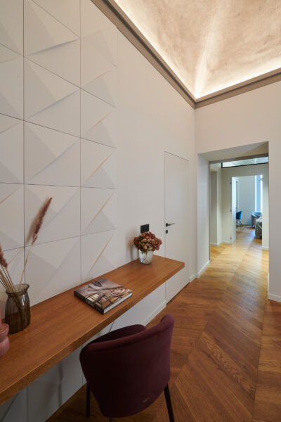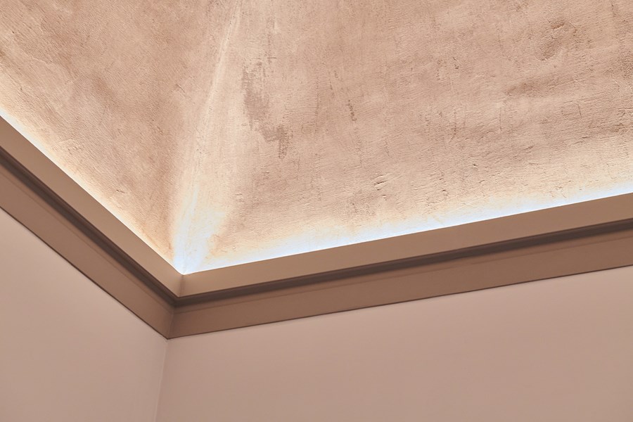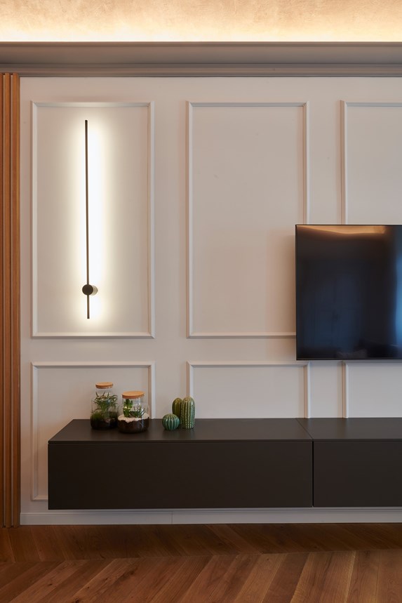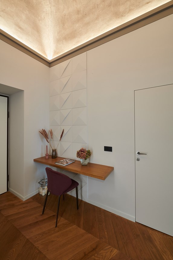 For this reason, various rooms in the flat have been fitted with profiles that blend harmoniously with the historic stucco elements. In the hallway, a frame of profiles for indirect lighting (IL 9 MEMORY) was used to emphasise and highlight the vaulted ceiling. On the wall, the PUZZLE Wall Tiles give the wall character. The three-dimensional design element can be applied in different ways, providing plenty of individuality.