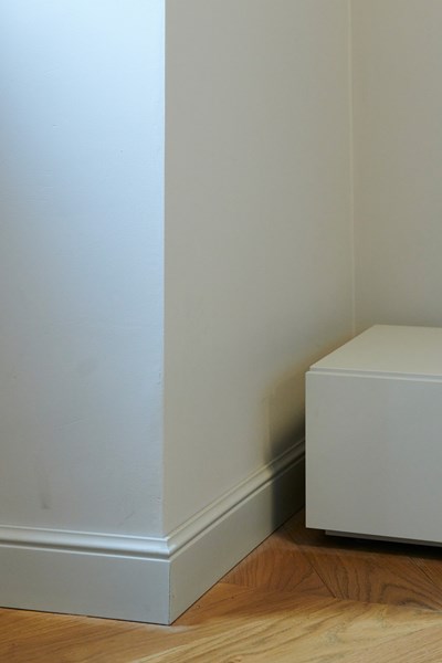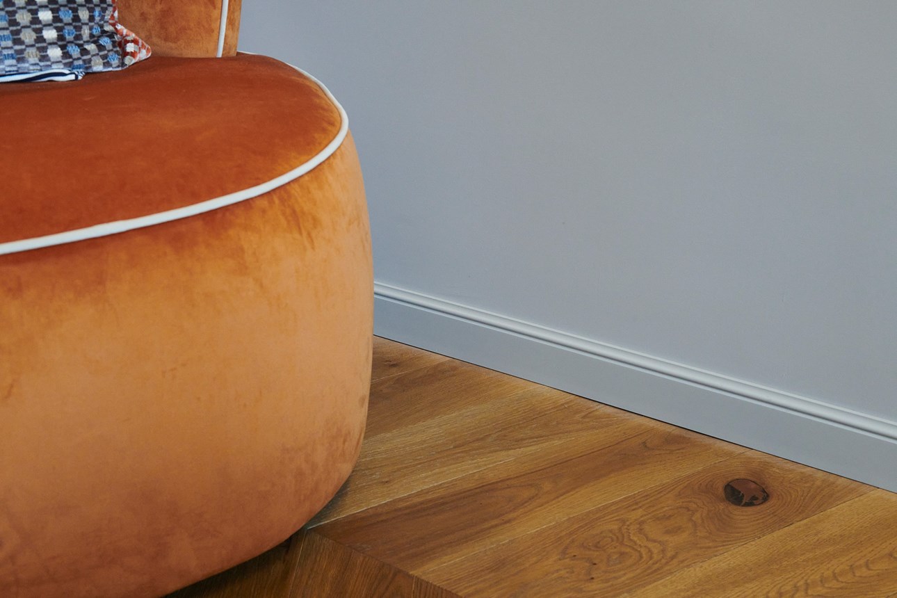 The careful selection of profiles is complemented by the FL1 WALLSTYL skirtings, which are also in the same colour as the wall to give it continuity. The skirtings harmonise with the high-quality parquet flooring without being obtrusive.